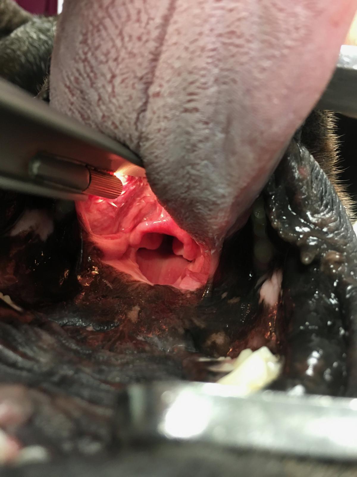 Sténose importante des deux narines Correction chirurgicale de la narine droite Correction chirurgicale des deux narines Chien opéré des narines: 10 jours post opératoire Exploration sous anesthesie: Elongation du voile du palais Voile après opération Larynx: Eversion des diverticules laryngés